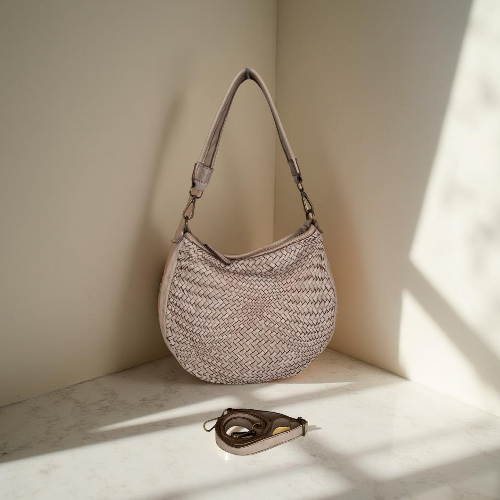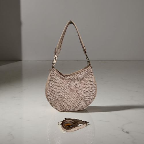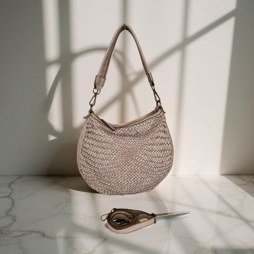 A sculptural braided top handle commands attention, while the undulating wave-woven facade introduces subtle textural sophistication.