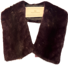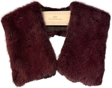 • Load image into Gallery viewer, A purple mink scarf with lining and fur hook fastening, displayed on a flat surface.