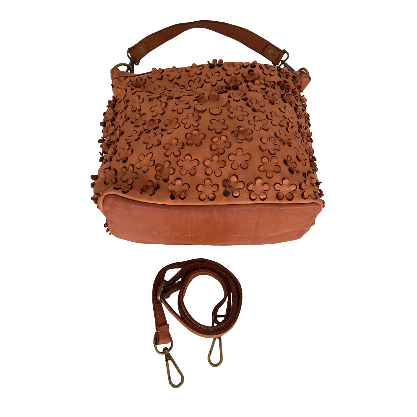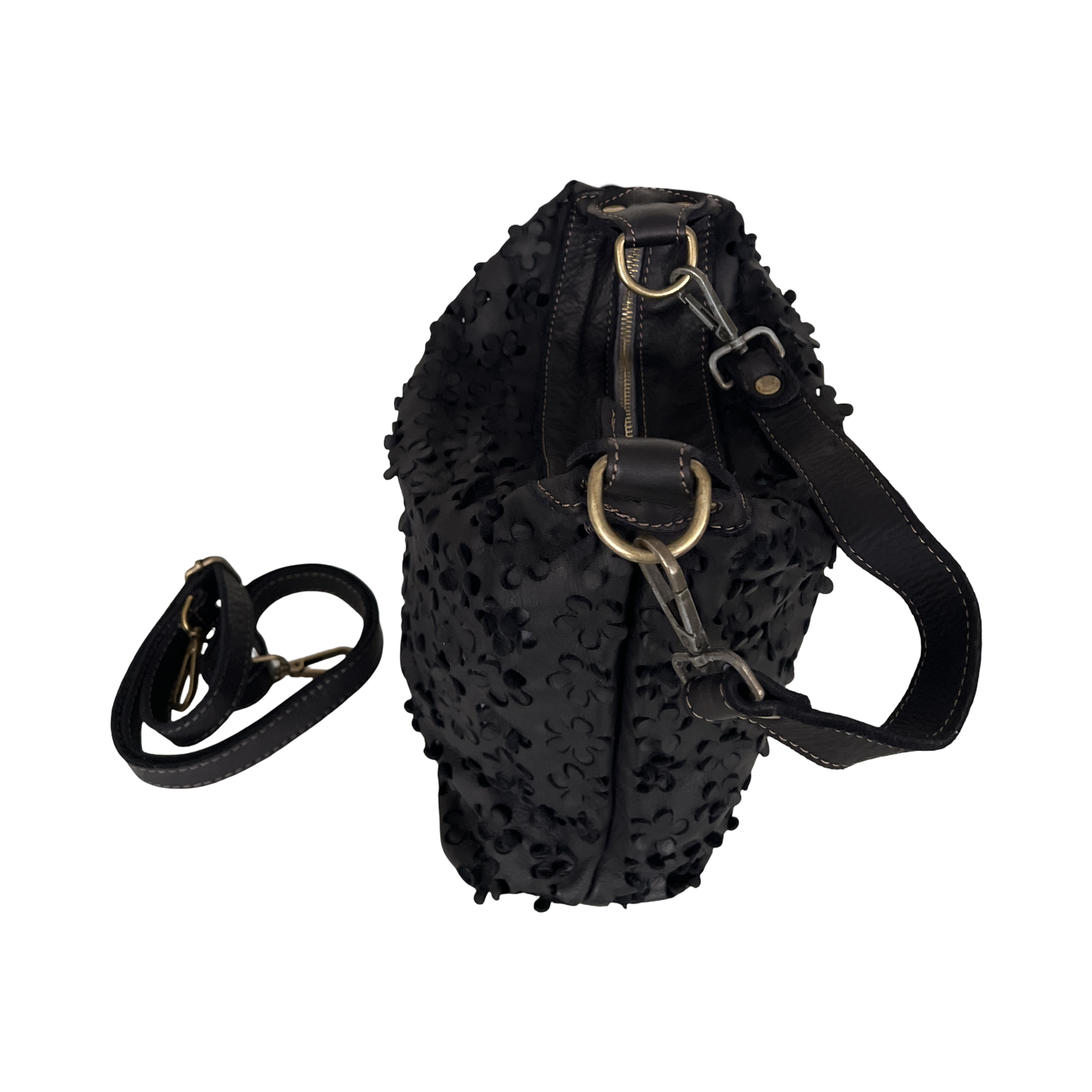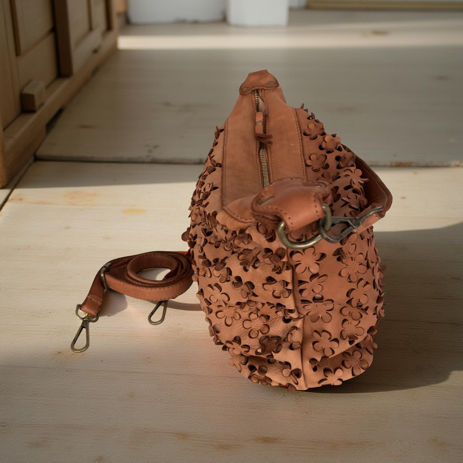 The washed calf leather showcases an exquisite floral laser-cut pattern with delicate fringe accents, while brass-tone hardware adds sophisticated polish.
