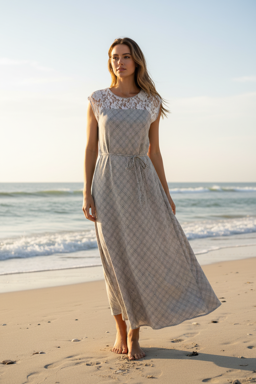 Beige grey  diagonally checked pattern linen long dress with a string to adjust width