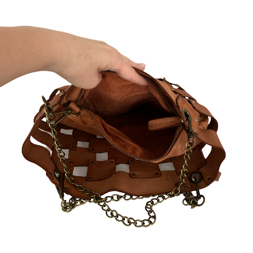 Antique brass hardware complements the raw, unlined interior—a deliberate design choice that emphasizes material authenticity.